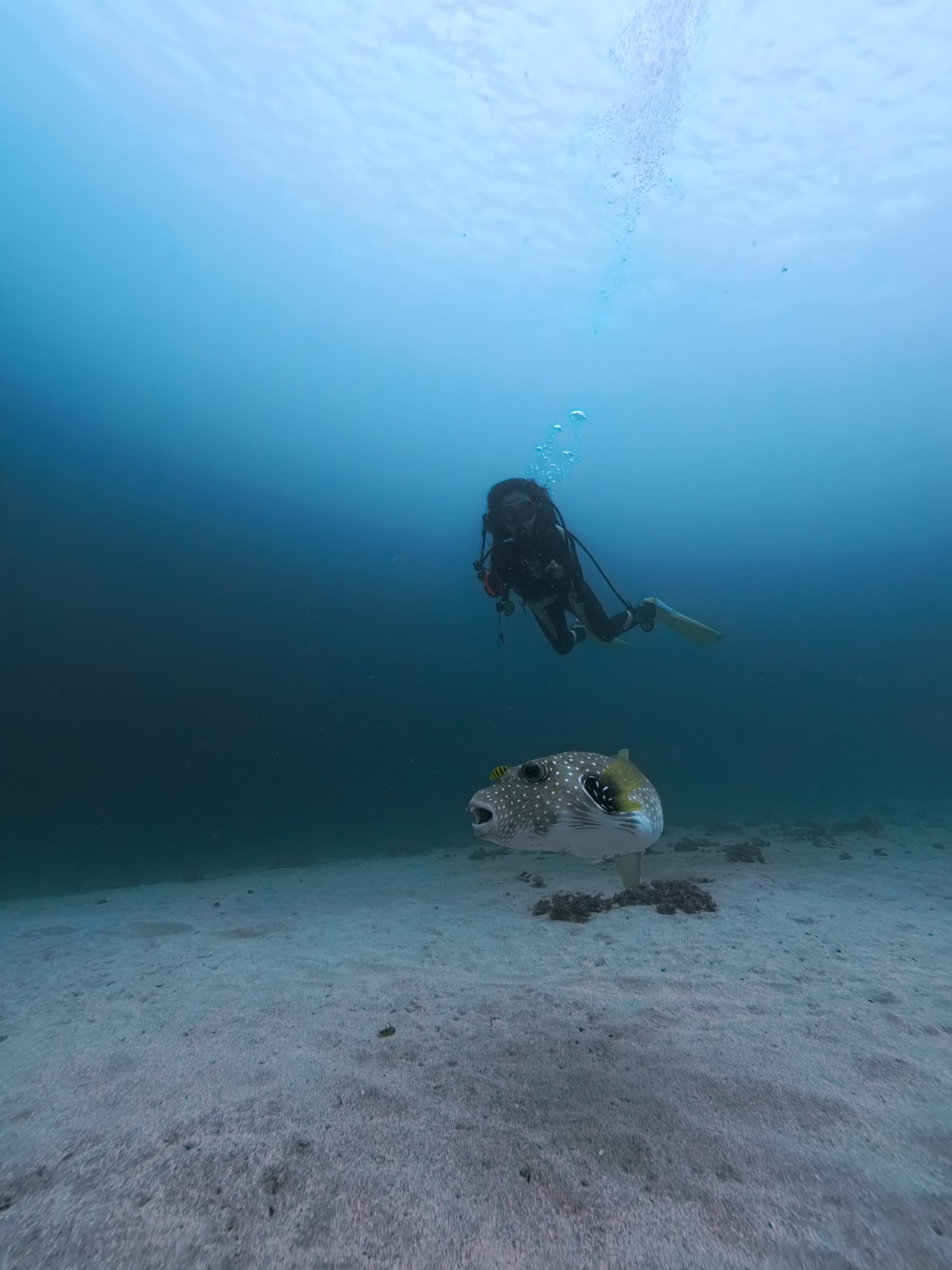 泳ぐたびに胸ビレを広げる姿に、ゲストのカメラは止まりませんでした。マクロもワイドも一度に楽しめるのが、パダンバイの大きな魅力です。