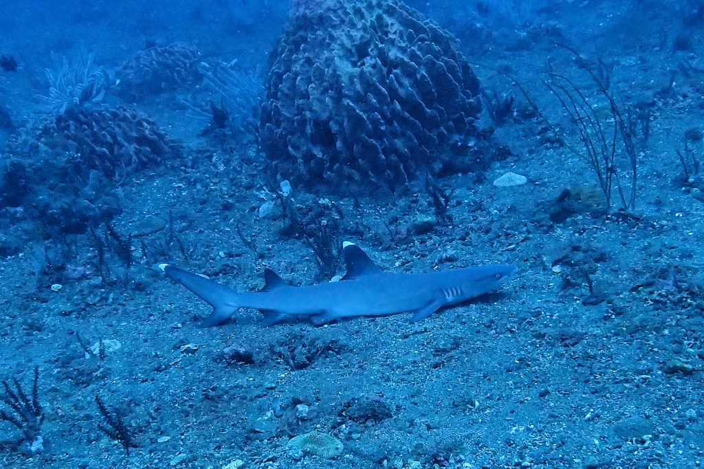 このダイブでまず目を引いたのが、ホワイトチップシャークが2匹。