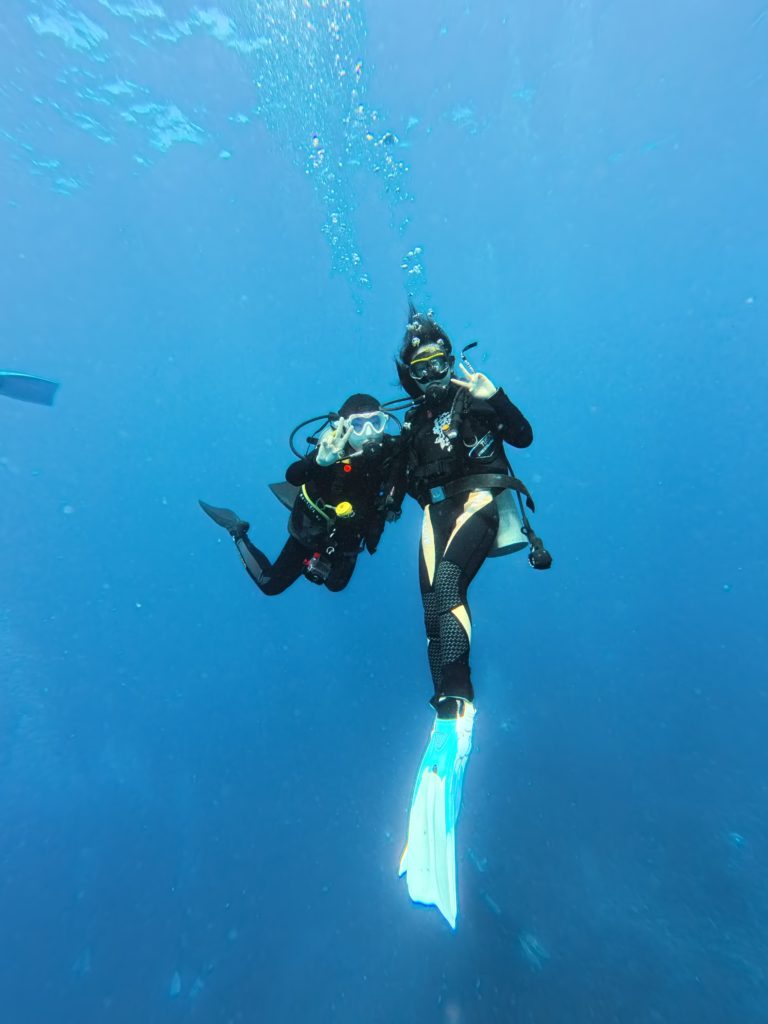 今回のゲストさんは、男性がファンダイブ、女性が体験ダイブというスタイル。パパスダイブセンターでは、このように経験レベルが異なる場合でも、それぞれに最適なガイド体制で安全に楽しんでいただけます。今回はガイド2名体制で、それぞれのペースに合わせたダイビングを実施しました。