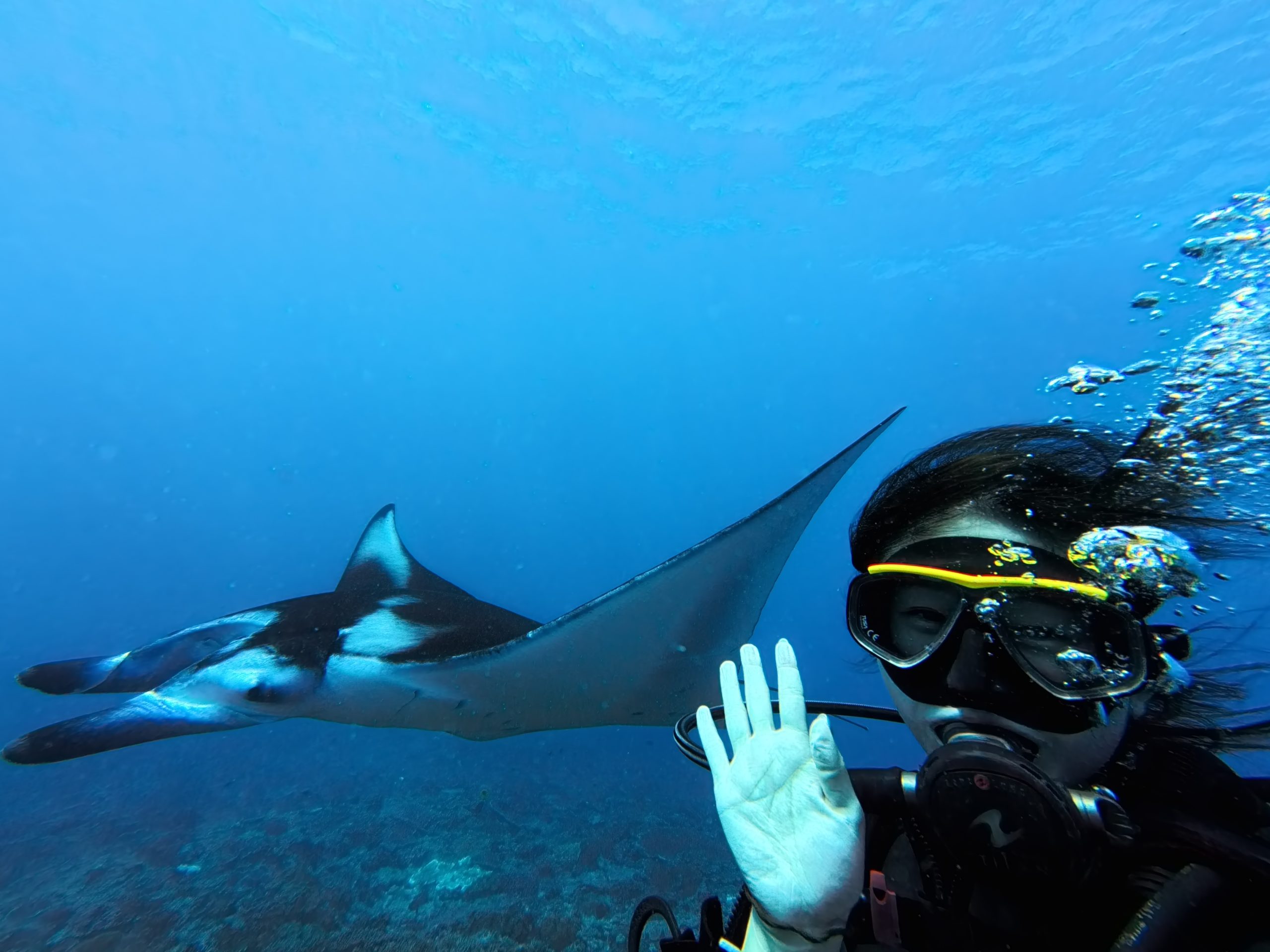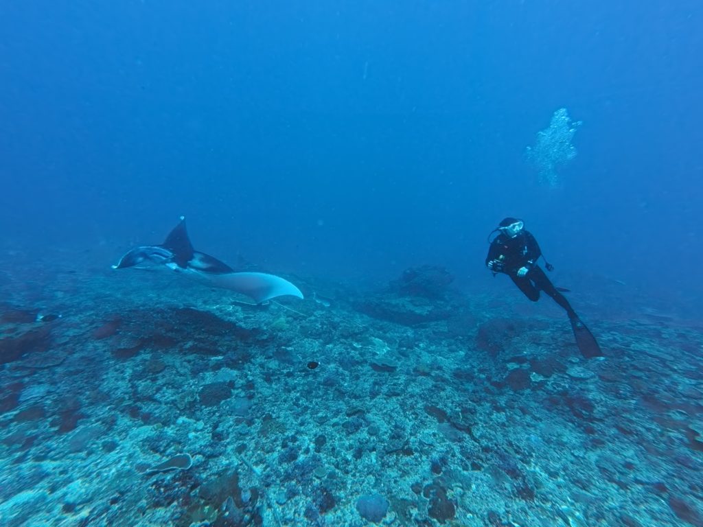 午後から風が強まる予報だったため、まずは最優先でマンタポイントへ。透明度は約20m、水温28度と快適なコンディションです。クリーニングステーションに到着すると、小ぶりながら1枚のマンタがゆったりとホバリング。さらに少し深場へ目を向けると、体格の良いマンタが3匹ほど旋回している姿も確認できました。